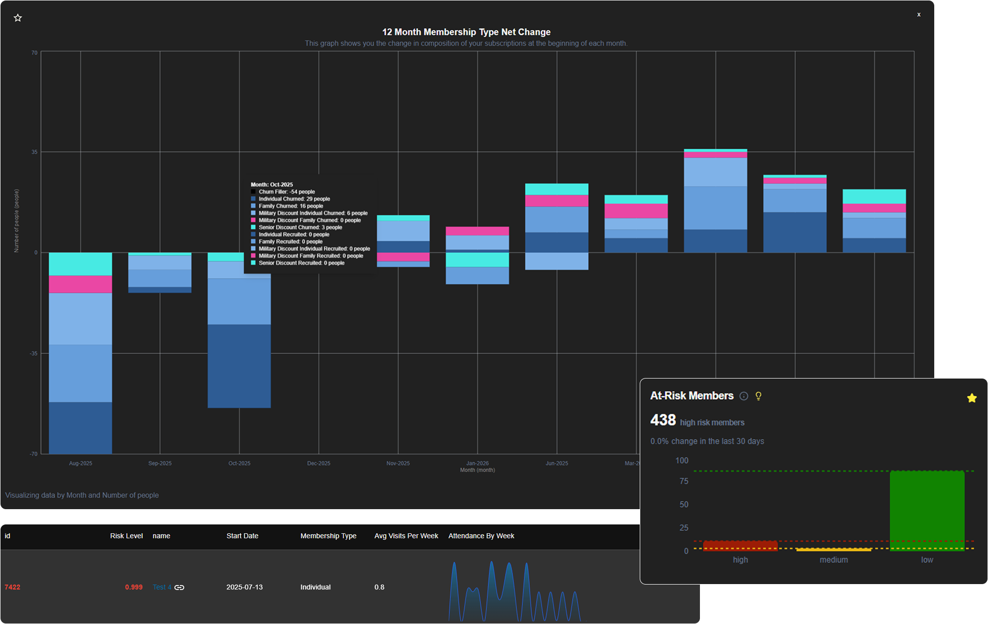 GroeFit’s Risk Score helps gym operators identify members who are quietly disengaging — before churn happens. By analyzing visit patterns and behavioral shifts, GroeFit surfaces early warning signs so teams can act with intention, not guesswork.